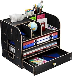 Organiseur de bureau, grand organiseur de bureau en bois avec tiroir pour crayons, rangement pour bureau, maison et école, 32 x 26 x 22,5 cm Noir