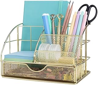 Asalin Ao Desk Organiseur de bureau en métal, porte-stylo, organisateur de documents et tiroir, accessoires de bureau en maille pour bureau, école et maison (doré)
